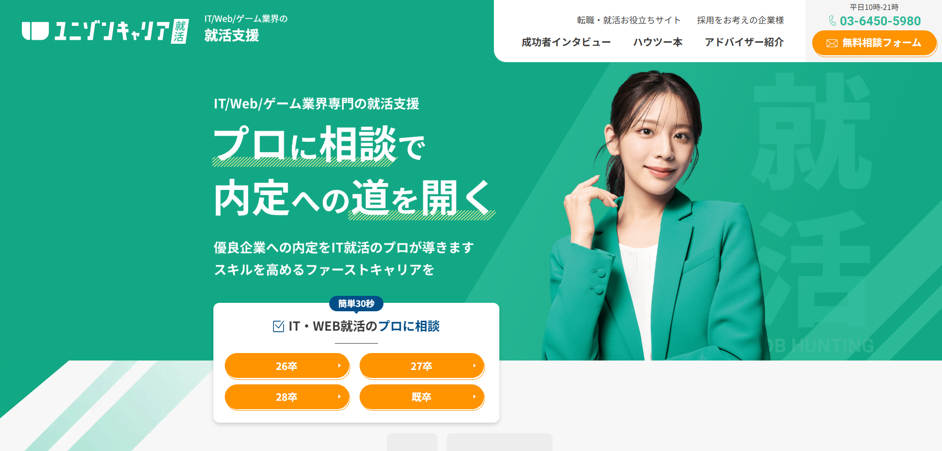 質の高い就活サポートにより内定率は85%以上、最短2週間での内定獲得も可能。ITエンジニアとしてのキャリアを成功させたい学生におすすめです。